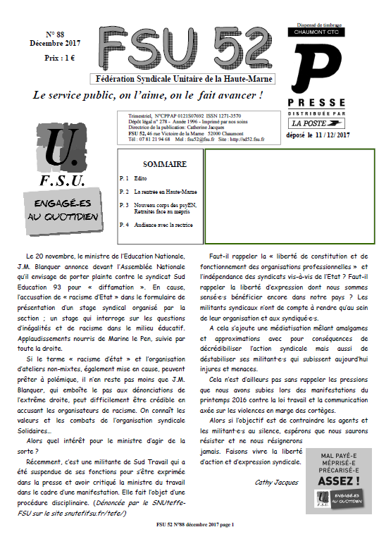 CHAUMONT - Tractage dès 06h30 au rond-point piscine Gagarine - Rassemblement 17h mairie - prise de parole intersyndicale (FSU, CGT,[...]